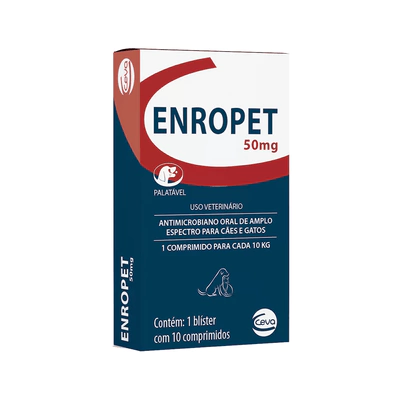 O Antibiótico Ceva Enropet 50 mg, é indicado no tratamento de infecções em cães e gatos causadas por bactérias Gram-positivas e Gram-negativas, espiroquetas e micoplasmas. Enropet é eficaz no tratamento das: enterites, infecções do trato respiratório, do aparelho geniturinário, dérmicas e otites.