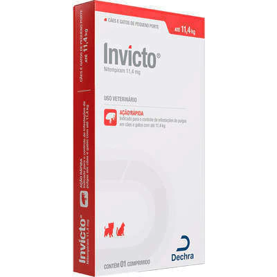 O Ectoparasiticida Dechra Invicto 11,4 mg para Cães e Gatos de Pequeno Porte é indicado para controle de infestações de pulgas. O nitempiram pertence à classe química dos neonicotinóides, atua bloqueando os receptores nicotínicos da acetilcolina, porém não interfere na acetilcolisnesterase, desta forma, resultando na paralisia e morte das pulgas adultas. Em estudo, observou-se uma eficácia superior a 90% em cães e gatos.