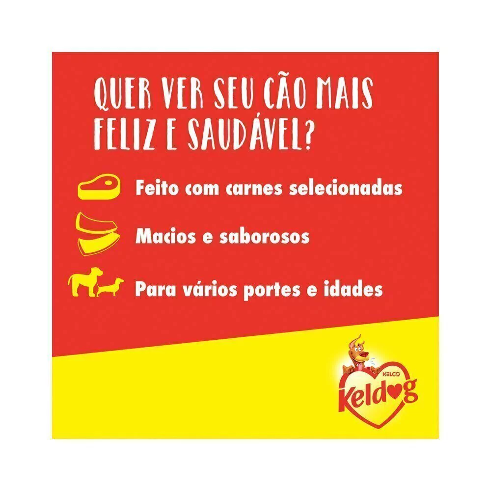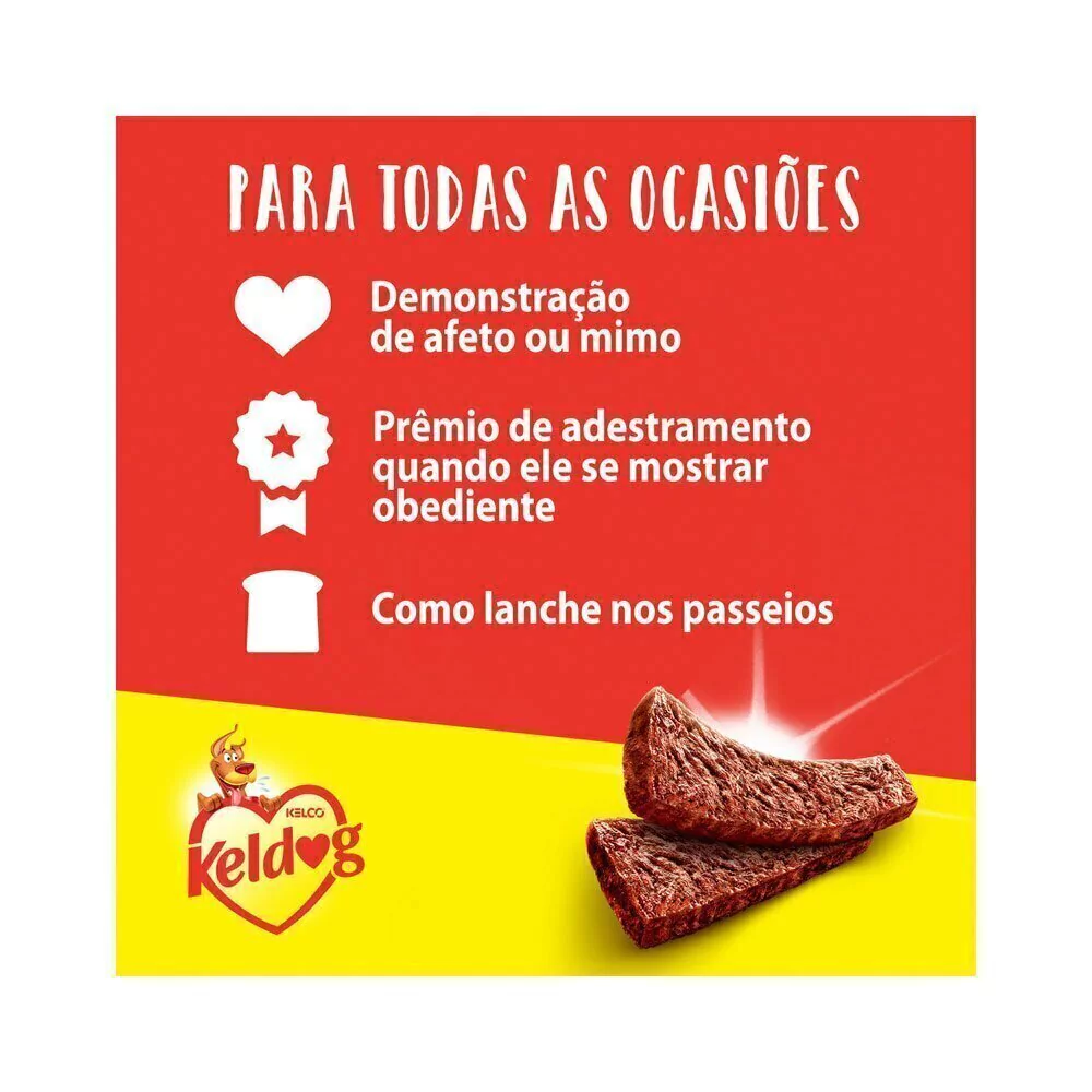Feito 100% de carne, o Bifinho Churrasco Keldog vem no formato perfeito para estimular o paladar dos nossos pets: tirinhas macias com pequenas ranhuras, onde o sabor fica ainda mais intenso. É um petisco semiúmido, com aroma concentrado, que aguça ainda mais os sentidos; irresistível!.