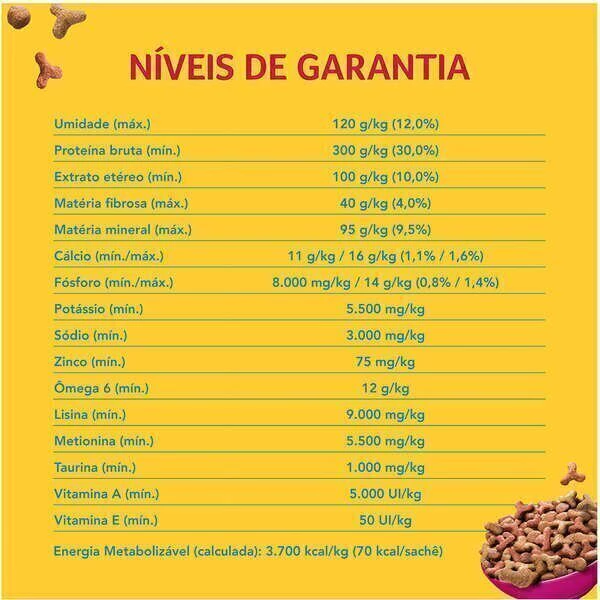Milho integral moído*, farinha de carne e ossos de bovinos, farinha de subprodutos de frango, farelo de glúten de milho*, farelo de soja*, quirera de arroz, farinha de subprodutos de peru, gordura animal estabilizada, levedura seca de cervejaria, cloreto de sódio (sal comum), fosfato bicálcico, cloreto de potássio, hidrolisado de fígado de ave e suíno, DL-metionina, L-lisina, taurina, vitaminas (A, D3, E, K3, B12, mononitrato de tiamina, suplemento de riboflavina, cloridrato de piridoxina, niacina, biotina, ácido fólico, pantotenato de cálcio, cloreto de colina), minerais (sulfato de zinco, sulfato ferroso, sulfato de cobre, sulfato de manganês, iodato de cálcio, selenito de sódio), corantes (amarelo 5, amarelo 6, azul 2, vermelho 40 e dióxido de titânio), ácido fosfórico, antioxidante BHT. *Espécies doadoras do gene: Agrobacterium tumefaciens, Bacillus thuringiensis e Streptomyces viridochromogenes.