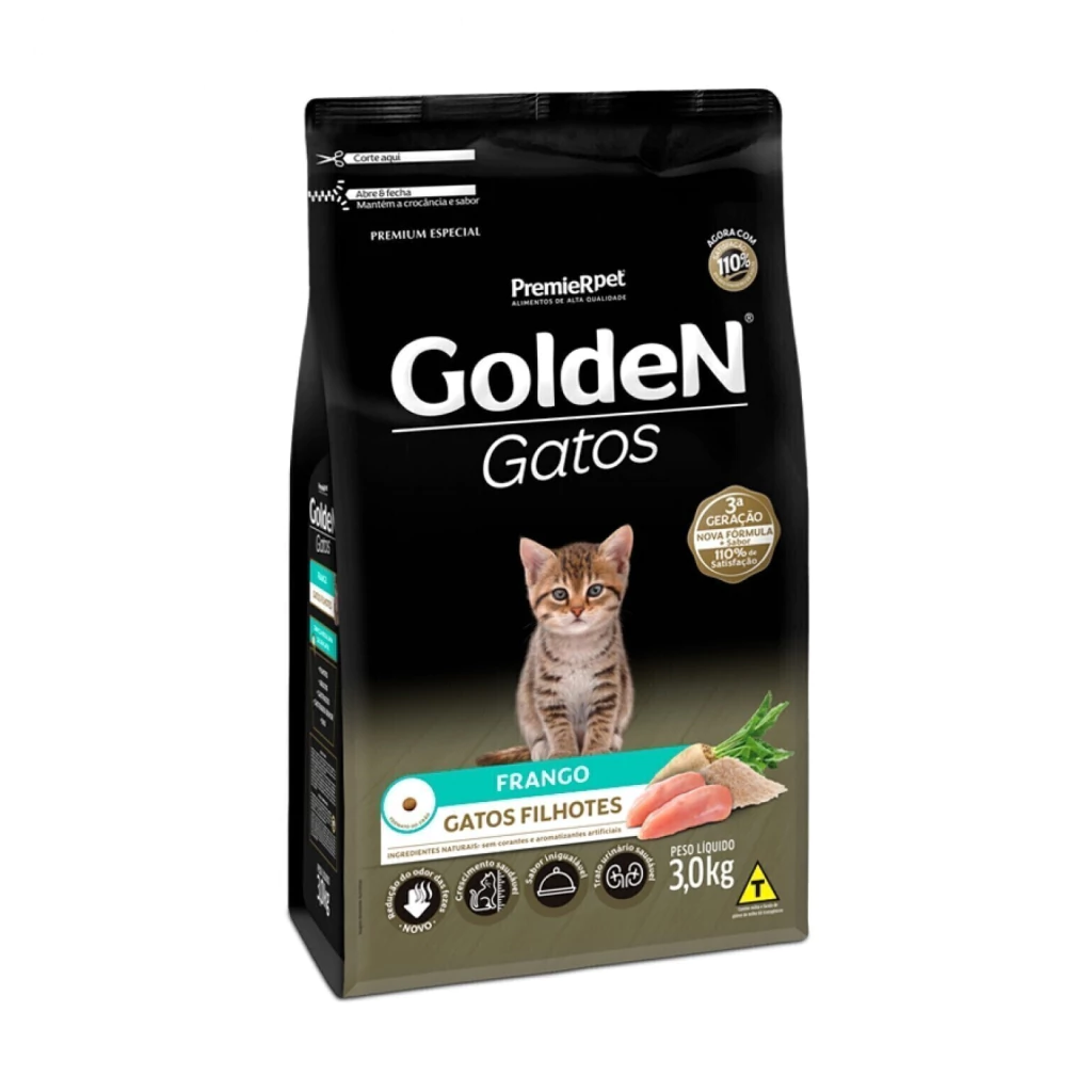 Produzido pela Premier, a Ração Golden Gatos Filhotes Sabor Frango está disponível em três tamanhos: 1, 3 e 10,1 kg. Tudo isso para facilitar o seu dia a dia e deixar seu pet mais saudável.