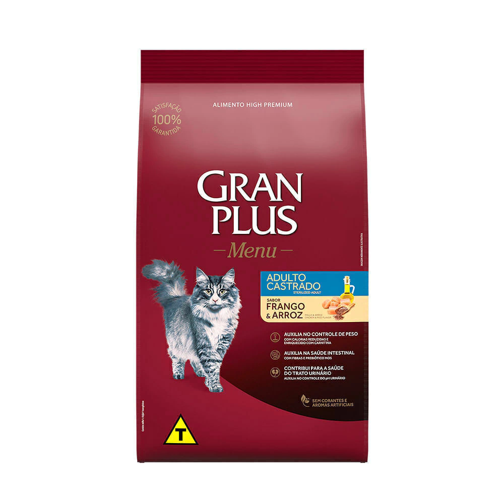 A Ração Gran Plus Frango e Arroz para Gatos Castrados Adultos é um alimento de alta qualidade, com controle de calorias e feito com ingredientes nobres e funcionais, que proporciona uma experiência irresistível para seu gato castrado enquanto ajuda a manter seu peso.