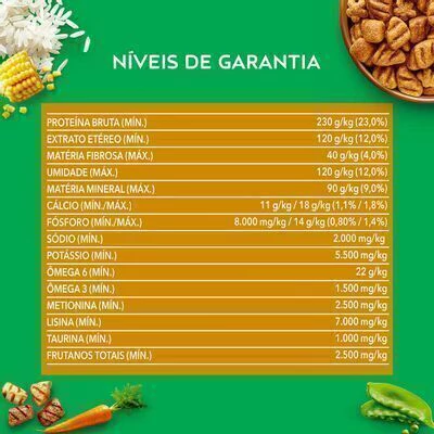 Contém ingredientes de alta qualidade, como carne, frango e arroz;