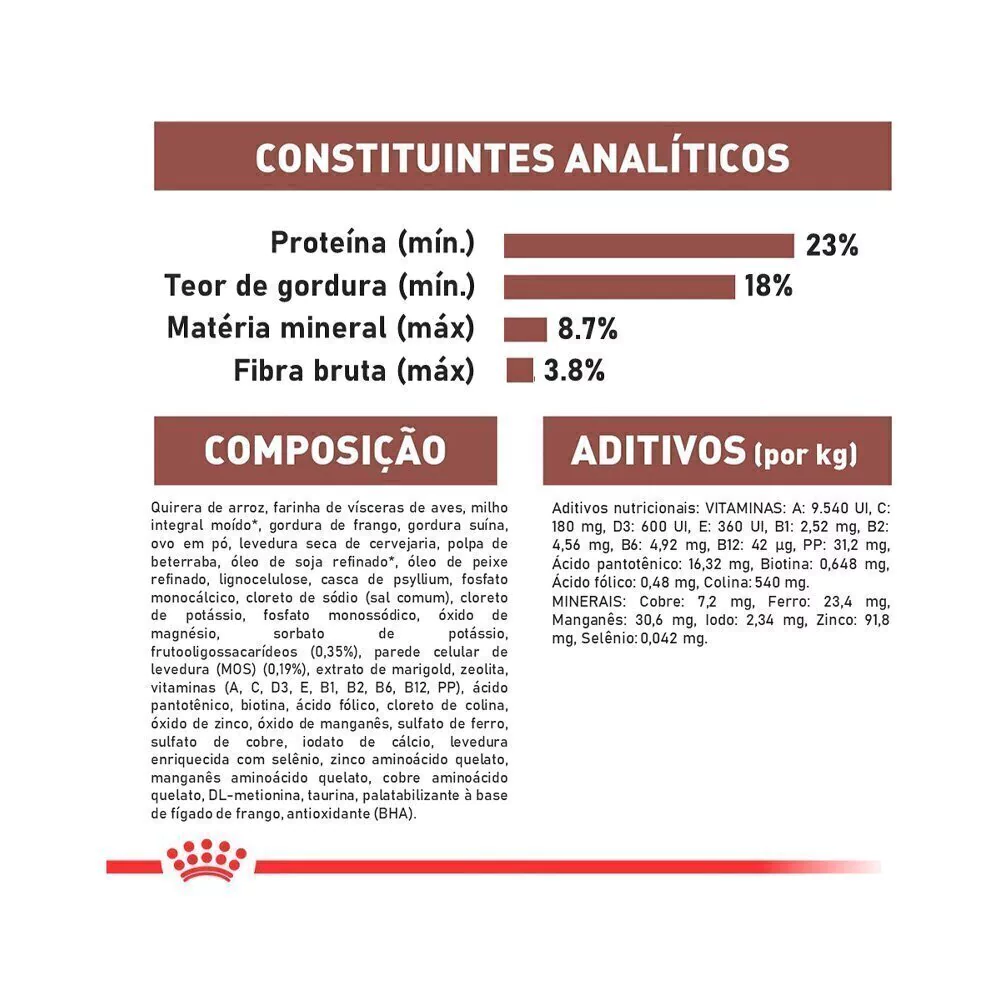 Umidade (máx.): 100 g/kg (10%); Proteína Bruta (mín.): 230 g/kg (23%); Extrato Etéreo (mín.): 180 g/kg (18%); Matéria Fibrosa (máx.): 38 g/kg (3,8%); Matéria Mineral (máx.): 87 g/kg (8,7%); Cálcio (mín.): 7.080 mg/kg (0,708%); Cálcio (máx.): 16,52 g/kg (1,652%); Fósforo (mín.): 6.000 mg/kg (0,6%); Sódio (mín.): 2.520 mg/kg (0,252%); Cloro (mín.): 4.140 mg/kg (0,414%); Potássio (mín.): 3.900 mg/kg (0,39%); Magnésio (mín.): 540 mg/kg (0,054%); Metionina (mín.): 4.830 mg/kg (0,483%); Taurina (mín.): 1.400 mg/kg (0,14%); EPA (mín.): 1.000 mg/kg (0,1%); DHA (mín.): 800 mg/kg (0,08%). ENERGIA METABOLIZÁVEL: 4.122 kcal/kg.
