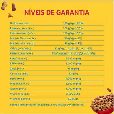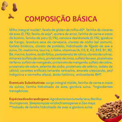 Milho integral moído*, farelo de glúten de milho*, farinha de subprodutos de frango, farelo de soja*, quirera de arroz, farinha de carne e ossos de bovinos, farinha de subprodutos de peru, cenoura desidratada, gordura animal estabilizada, levedura seca de cervejaria, cloreto de sódio (sal comum), fosfato bicálcico, cloreto de potássio, hidrolisado de fígado de ave e suíno, DL-metionina, taurina, L-lisina, vitaminas (A, D3, E, K3, B12, mononitrato de tiamina, suplemento de riboflavina, cloridrato de piridoxina, niacina, biotina, ácido fólico, pantotenato de cálcio, cloreto de colina), minerais (sulfato de zinco, sulfato ferroso, sulfato de cobre, sulfato de manganês, iodato de cálcio, selenito de sódio), corantes (amarelo 5, amarelo 6, vermelho 40, azul 2 e dióxido de titânio), ácido fosfórico, antioxidante BHT. *Ingredientes transgênicos. Espécies doadoras do gene: Agrobacterium tumefaciens, Arabidopsis thaliana, Bacillus thuringiensis, Streptomyces viridochromogenes e Zea mays.