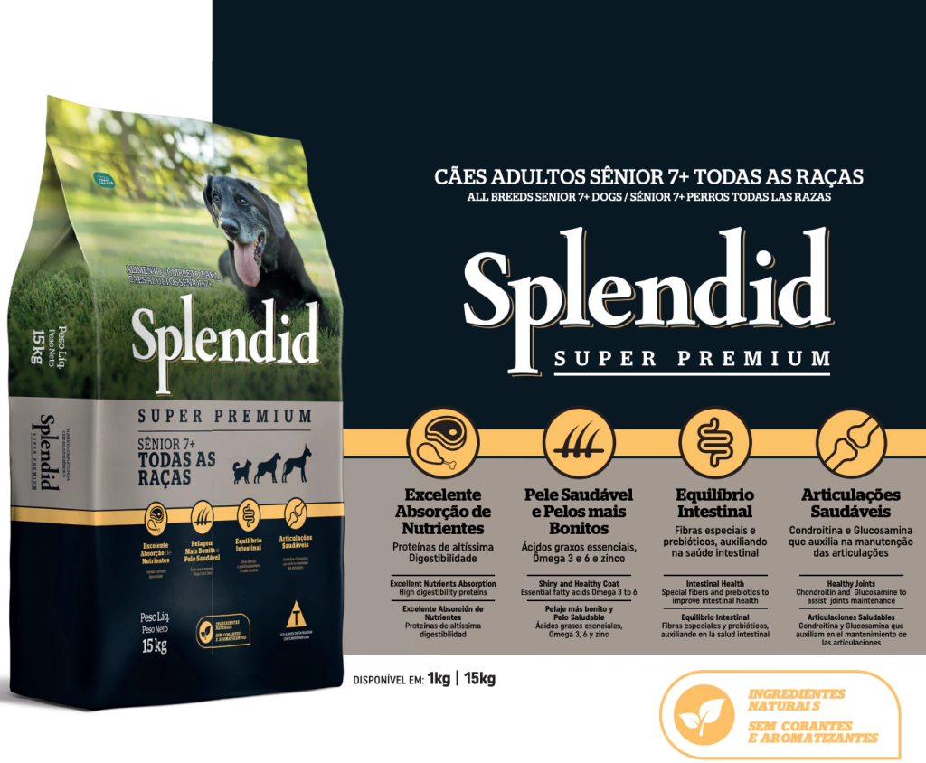 A ração Splendid Sênior é formulada com baixo teor de gordura para ajudar a manter um peso saudável e também é livre de corantes e conservantes artificiais, o que a torna uma opção saudável e segura para os cães idosos de todas as raças.